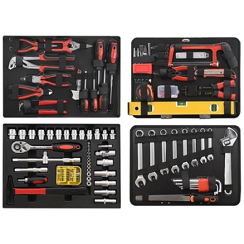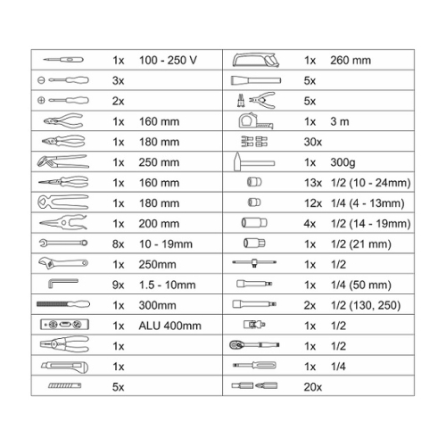 Sada nářadí ALU-PROFI značky Compass obsahuje 139 kusů nářadí. V propracovaném kufříku z odolného kovu tak najdete veškeré běžně potřebné nářadí včetně očkoplochých klíčů, vodováhy, goly, pilky, zalamovacího nože, kleští, elektrikářské zkoušečky a jiné. Přenosný kufr je vybavený exkluzivním CR-V nářadím uspořádaným do předem určených pozic ve 4 organizérech. Dno kufru pokrývá vložka pro ráčnu se 45zubým mechanismem. Své místo zde mají i její nástavce a příslušenství, dále kladivo a ráčnový šroubovák včetně bitů. 4 plochy pro nářadí Ve vrchní části kufru se zabudovaným organizérem naleznete šroubováky různých rozměrů a elektrikářskou zkoušečku. Také se zde nacházejí nejběžněji používané kleště, včetně kombinovaných, štípacích a střihacích. Kufr s ergonomicky tvarovanou rukojetí tvoří hliníková konstrukce s kovovými rohy a sponami pro bezpečné uzavírání. Mezi dnem a vrchní částí je pevně vložené oboustranné plato. Z jedné strany s očkoplochými klíči, nastavitelným klíčem, pilníkem a imbusovými klíči. Z druhé strany jsou umístěné vodováha, metr, nůž s náhradními čepelemi, pilka, důlčíky, kleště na segerovky a elektrikářské kleště včetně konektorů. Vlastnosti: Celá sada je roztříděná v pevném ALU kufříku Perfektní set nářadí pro vaši dílnu a domov i práci Ergonomicky tvarovaná rukojeť usnadní manipulaci 4 organizéry s přesně vymezenými místy pro nářadí Barva kufru: stříbrná Hmotnost: 11 kg Rozměry balení (Š x V x H): 33 x 36 x 18 cm Víko kufru: 1 x zkoušečka 100 – 250 V 3 x šroubovák křížový 2 x šroubovák plochý 1 x kleště štípací 160 mm 1 x kleště kombinované 180 mm 1 x kleště siko 250 mm 1 x kleště prodloužené 160 mm 1 x kleště na hřebíky 180 mm 1 x nůžky na plech 200 mm Pevně zabudované plato: 8 x klíč očkoplochý (10, 11, 12, 13, 14, 15, 17, 19 mm) 1 x nastavitelný klíč 250 mm 9 x imbus klíč (1.5, 2, 2.5, 3, 4, 5, 6, 8, 10 mm) 1 x pilník 300 mm 1 x vodováha 400 mm 1 x konektorové kleště 1 x nůž 5 x náhradní břit pro nůž 1 x pilka 260 mm 5 x sekáč malý 5 x kleště na ségrovky s nástavci 1 x metr svinovací 3 m 30 x konektory Dno kufru: 1 x kladivo 300 g 13 x nástavec 1/2 (10, 11, 12, 13, 14, 15, 16, 17, 19, 20, 21, 22, 24 mm) 12 x nástavec 1/4 (4, 4.5, 5, 5.5, 6, 7, 8, 9, 10, 11, 12, 13 mm) 4 x nástavec 1/2 dlouhý (14, 15, 17, 19 mm) 1 x nástavec 1/2 dlouhý na svíčky (21 mm) 1 x T vratidlo pro nástavce 1/2 1 x nástavec 1/4 prodlužovací 50 mm 2 x nástavec 1/2 prodlužovací 130mm a 250 mm 1 x nástavec 1/2 kloubový 1 x ráčna 1/2 1 x ráčnový šroubovák 1/4 20 x bity (plochý, křížový, imbus, torx)