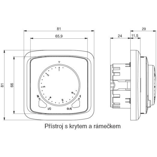 Termostat univerzální otočný (ovládací jednotka), volitelná funkce prostorového, nebo podlahového termostatu s lineárním nastavení teploty. Indikace stavu výstupu dvojbarevnou LED. Tlačítka pro zapnutí/vypnutí termostatu a pro ruční snížení teploty (s indikací LED). Pracovní teplota: 0…