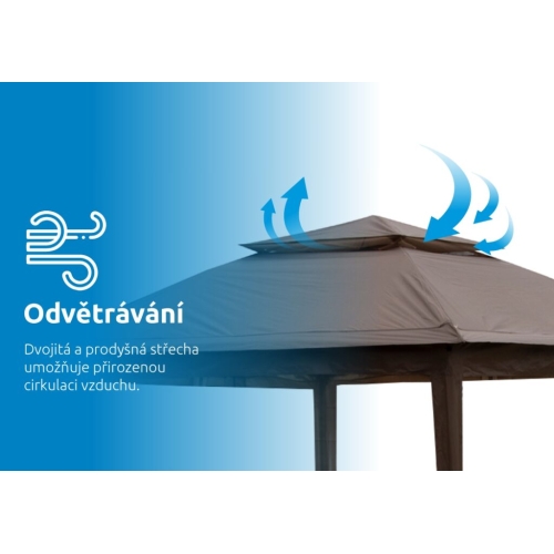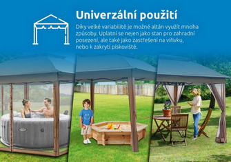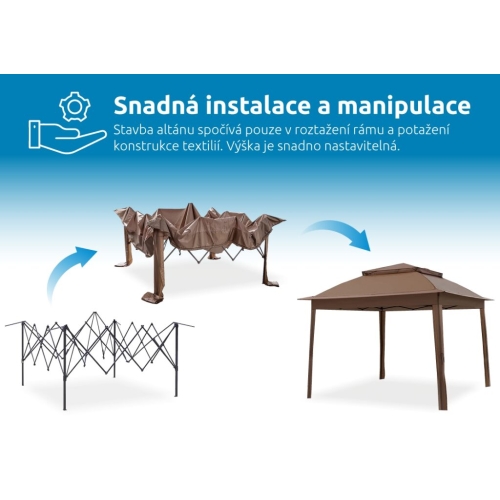 Zahradní altán Marimex Vista nabízí moderní a elegantní design pro každou příležitost. Hlavní předností jsou jeho rozměry 3×3 metry, díky kterým můžete altán využít nejen jako stan pro zahradní posezení, ale také jako zastřešení na vířivku, bazén, nebo například k zakrytí pískoviště. Stavba altánu je velmi jednoduchá. Spočívá pouze v roztažení rámu a potažení konstrukce textilií. Stěny altánu je možné úplně zatáhnout a uzavřít, případně ponechat roztažený jen vchod, nebo stěny kompletně otevřít a upevnit je k nohám altánu. Zahradní stan obsahuje 4 shrnovací moskytiéry k ochraně před komáry a jiným hmyzem a praktickou tašku pro přenášení. Teleskopické nohy jsou nastavitelné do 3 úrovní výšky. Snadná instalace jednou osobou: 1. roztáhnete rám altánu a instalujete plachtu 2. zatlačením na ovládací systém zvednete a uzamknete rám altánu 3. upravíte výšku nebo úhel pro preferované zastínění rozměry: 3 x 3 x 2,9 m hmotnost: 16,75 kg 4 shrnovací moskytiéry praktická taška pro přenos