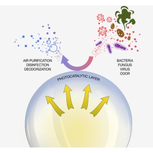 Antibakteriální LED zdroj pro spotřebitele s klasickým tvarem žárovky. Vlastnosti produktu: LED alternativa ke konvenčním světelným zdrojům. Nestmívatelné. Dobré podání barev (Ra ≥ 80) a barevná stálost po celou dobu životnosti světelného zdroje. Výhody produktu: Velmi nízká spotřeba energie. Může být snadno namontováno místo obyčejných žárovek. Rozkládá a neutralizuje pachy. Neškodné pro lidi a zvířata. Ničí bakterie přenášené vzduchem: Escherichi coli, H1N1 (Chřipka). Oblasti použití: Domácí použití. Všeobecné osvětlení. Venkovní použití pouze ve venkovních svítidlech (minimálně IP65).