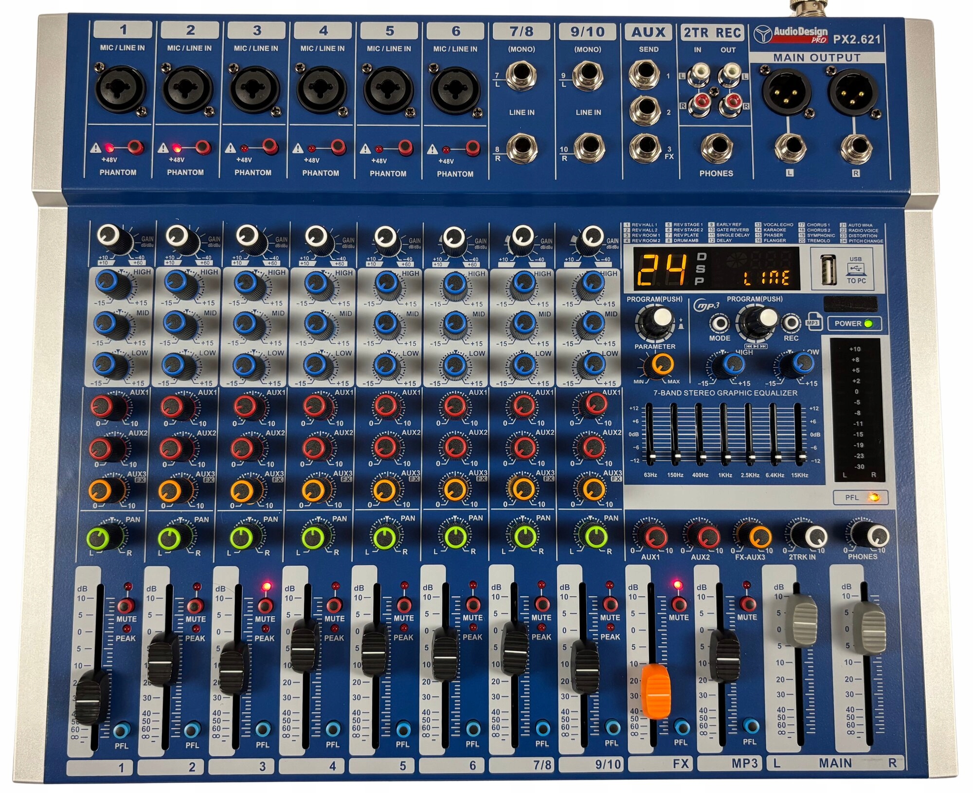 Audio. Design PX2. 621 mixpult Audio. Design mixpult, 10 kanálů, tahové fadery, zabudovaný přehrávač MP3/WAV a rekordér na USB disk, Bluetooth, 6x mono, 2x stereo, phantom zapínatelný na mono vstupech, 24 DSP efektů, 7-pásmový grafický ekvalizér, 3x Aux, sluchátkový výstup s…