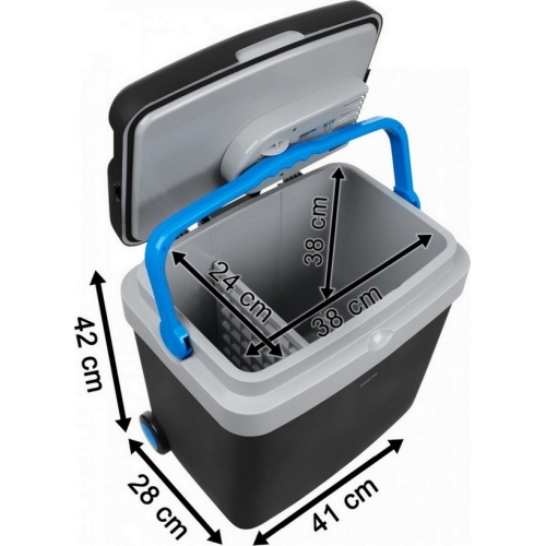 Moderní termoelektrická autochladnička se vám bude hodit pro celou řadu příležitostí: na dovolenou do kempu, na piknik do parku, na výlet k rybníku, na návštěvu nebo na celodenní rybaření. Všude tam se vám bude hodit velký vnitřní objem, režim chlazení a ohřívání, snadná přeprava z místa na místo díky vysunovací ergonomické rukojeti a velkým kolečkům, důmyslný zavírací systém zajišťující, že víko jde otevřít pouze, pokud je sklopená hlavní rukojeť a pokud je víko otevřené, speciální plastový blok na horní části víka znemožňuje, aby víko spadlo a například nepříjemně zranilo ruce apod. Jistě budete rádi i za úsporný Eco režim, díky kterému autochladnička potřebuje na svůj provoz opravdu jen minimum elektřiny. Jsem autochladnička s velkým objemem 33 l Ať už se chystáte na večírek, několikadenní rybaření, pod stan či na piknik, nebojím se nazvat, že jsem ideální parťačkou! Na termoelektrickou autochladničku mám skvělý objem 33 l a můžete do mě pohodlně uložit devět PET lahví o objemu 1,5 l nebo pět o objemu 2 l a stále pohodlně zavřete poklop! Pánové jistě uvítají v parném dni vychlazené pivko a milovníci jídla mohou převážet mnoho potravin. Chladím i ohřívám Umožňuji chlazení až 16 °C pod okolní teplotu a ohřívání do rozmezí 50-60 °C. Účinnou a kvalitní izolací ochraňuji studený/teplý vzduch, aby neucházel prostřednictvím stěn. Oba dva režimy indikuji LED osvětlením, abyste vždy věděli, jestli chladím nebo ohřívám. Bez většího úsilí si můžete dopřát super osvěžení v letních dnech nebo udržet teplé pokrmy na plánovaný celodenní piknik. Umožňuji snadnou a praktickou přepravu Jelikož mám perfektní objem, nejsem žádné tintítko. Proto mi pomáhají 3 užiteční pomocníci pro snadnou manipulaci a přenášení. K přepravě po trávníku, chodníku a jiných plochách mi pomáhají dvě kolečka, která jsou dostatečně velká, aby mě unesla, i když jsem plná dobrot a drinků. Ke kolečkům je připojená i rukojeť, která je ergonomicky tvarovaná a pohodlně padne do ruky. Navíc, rukojeť je vysunovací, má skvělou délku a dokážu se tak přizpůsobit komukoliv, aniž by se ke mně musel někdo ohýbat. Obstarávám tak maximálně komfortní přepravu. Mojí poslední a nepostradatelnou součástí je velká pevná rukojeť, která je určena pro snadné přenášení nebo přesunutí, když mě není potřeba převážet. S Eco režimem zajišťuji nízkou spotřebu elektřiny Energetickou třídou F čerpám minimum elektřiny na svůj provoz s příkonem jen 60 W. Můžete mě naplno využívat v autě nebo kdekoliv, kde je k dispozici zásuvka. Stačí jednoduše přizpůsobit kabel autozapalovači 12 V nebo síťové zdířce 230 V. Chytrý zavírací systém! Myslím na vaše bezpečí! Pokud je víko otevřené, plastovým blokem znemožňuji, aby spadlo a poranilo ruce. Bráním samovolnému otevření! K zpřístupnění víka dojde až za předpokladu, že je sklopena hlavní rukojeť.