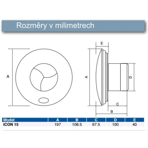 Kruhový koupelnový ventilátor s automatickou žaluzií od značky Airflow Icon 15 ECO využijete pro menší koupelny nebo toalety k odsávání vzduchu z bytových i nebytových prostor. Kvalitní ložisko zaručuje bezproblémový chod při montáži jak do zdi tak do stropu. Disponuje kompaktními rozměry o průměru 100mm a nabízí příkon 9,2W. Přístroj je navržen pro nepřetržitý provoz a nenáročnou údržbu. Specifikace koupelnového ventilátoru s automatickou žaluzií Airflow Icon 15 ECO 1245636 Axiální koupelnový ventilátor Airflow Icon 15 ECO v bílé barvě je vybaven automatickou žaluzií, která se automaticky otevře 20 sekund po spuštění a po jeho vypnutí se opět zavře. Zaručuje tichý chod díky kuličkovým ložiskům, dlouhou životnost 40 000 hodin a snadnou instalaci. Patentovaná třílistá uzavírací klapka zabraňuje zpětnému pohybu vzduchu. Max. hlučnost dosahuje 35dBA při akustickém tlaku 29,7 dB(A)/3m, jde tudíž o tichý přístroj. Ventilátor uvádí do pohybu spolehlivý motor s příkonem 9,2W a nízkou spotřebou. Průtok vzduchu u Airflow Icon 15 ECO činí 63 m³/h při max. tlaku 32Pa. Krytí ventilátoru IP24 umožňuje instalaci do bezpečnostní zóny 2. Kruhový axiální ventilátor získal cenu Red Dot Award. Vhodné ložisko pro montáž stropu Pořídit si u nás můžete i další typy ventilátorů. Nabízíme například ventilátory stolní a stojací, průmyslové či koupelnové a případně i příslušenství. Za prohlídku stojí i naše bohatá nabídka kabelů a konektorů či nářadí, kde nechybí ani lisovací (krimpovací) kleště, odizolovací nářadí, štípací kleště na kabely – ani elektrické a AKU nářadí. Rozměry ventilátoru Airflow Icon 15 ECO – kruh o průměru 100mm. Technické detaily koupelnového ventilátoru s automatickou žaluzií Airflow Icon 15 ECO Koupelnový ventilátor s automatickou žaluzií Airflow Icon 15 ECO je konstruován pro napětí 230V se síťovou frekvencí 50Hz a jeho hmotnost činí 0,74kg. Provozní teplota může dosáhnout hodnoty až +40 °C. Vždy se řiďte postupem od výrobce a montáž provádějte jen tehdy, jste-li k takovému úkonu oprávněni. V opačném případě přenechte instalaci na odborníkovi s příslušným certifikátem. Certifikáty výrobku Koupelnový ventilátor s automatickou žaluzií Airflow Icon 15 ECO splňuje příslušné normy ČSN. O společnosti Airflow Britská společnost Airflow Development Ltd. představuje světového lídra v oblasti vývoje a výroby měřící techniky pro vzduchotechniku, rekuperačních jednotek a ventilátorů. Na trhu působí již přes 60 let. V r. 1955 byla založena skupina Airflow Developments, která zpočátku sídlila v továrně ve městě High Wycombe na jihovýchodě Anglie. Po mezinárodních oceněních a obchodních úspěších se firma značně rozrostla. Po rekonstrukci továrny v průmyslovém bloku je v centrále v High Wycombe otevřen nejmodernější showroom a školící prostory Air Academy. Na našem e-shopu máme k dispozici od této společnosti ventilátory s příslušenstvím Airflow.