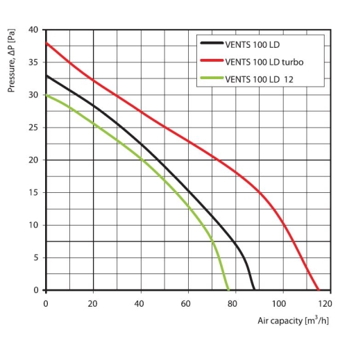 Ventilátor VENTS 100 LDA 12V – hliníkový kryt, 12V / 50Hz, nástěná montáž, IP34, přední hliníkový kryt, 77m3/h.Domovní axiální ventilátor Vents LD je určen k odsávání vzduchu z menších bytových a nebytových prostor jako jsou koupelny, toalety, kuchyně, prodejny, kanceláře a podobně. Vzhledem ke svým technickým parametrům se doporučuje ventilátory používat v kombinaci s kratšími vzduchotechnickými potrubími s nižší tlakovou ztrátou, popřípadě k odsávání přímo přes stěnu. Základní model je vybaven motorem s kluzným uložením rotoru. V případě montáže do stropu nebo při využívání ventilátoru k dlouhodobému chodu se doporučuje použití ventilátoru vybaveného kuličkovými ložisky. Součástí ventilátoru není zpětná klapka. K tomuto ventilátoru je možno objednat zpětnou klapku „KO“.
