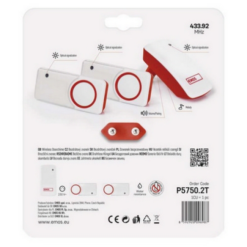2 530 KčBezbateriový domovní bezdrátový zvonek do zásuvky se 2 tlačítky EMOS P5750.2T