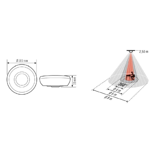 Plně automatické stropní čidlo přítomnosti 360°, na omítku. Napětí: 230 V/50 Hz Příkon: 0,2 W Oblast detekce: 360° Dosah: Ø 8 m Teplota okolního prostředí: 0 °C…+50 °C Stupeň ochrany krytí: IP 40 Třída ochrany: II Typ instalace: na omítku při montážní výšce od 3 m do 5 m Materiál: UV-stabilní polykarbonát Rozměry: výška 33 mm, Ø 99 mm, připojovací svorky 4 mm² Součást balení: kryt snímače Citlivost světla: 5 – 1000 Lux Barva: bílá Možnost manuálního spínání, spínání při průchodu napětí nulou. Lze nastavit mechanicky přes potenciometr. Tovární nastavení 100 Lux/5 min.