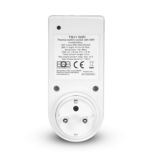 Bílou bezdrátovou zásuvku s WiFi ovládáním snadno naprogramujete. Po nastavení funguje i bez WiFi připojení. Barevně odlišené kontrolky Vás informují o jejím chodu. Ryze český výrobek. Specifikace dálkově ovládané zásuvky ELEKTROBOCK TS11 s WiFi 0076 Bezdrátová zásuvka TS11 WiFi je určena ke spínání domácích spotřebičů celkem ve 4 režimech. Tyto režimy si nastavíte přes mobilní aplikaci EOB WiFi, která je kompatibilní s operačním systémem iOS i Android anebo webovou aplikaci. Po naprogramování funguje nastavený program i bez WiFi v autonomním režimu. Dálkově ovládaná zásuvka ELEKTROBOCK disponuje zelenou a červenou indikační LED kontrolkou. Zelená indikuje v případě stálého světla stav napájení, v případě blikání režim přístupového bodu (AP). Červená kontrolka při plném svitu signalizuje sepnutý výstup, při blikání poukazuje na problém s WiFi připojením. Tlačítkem uprostřed zařízení můžete krátkým stiskem ( 10sec) obnovit tovární nastavení. Režimy bezdrátové zásuvky: 1. Automatický časový program, podle kterého budou pracovat Vaše spotřebiče, osvětlení apod. Lze nastavit až 16 změn v každém dni. 2. Časování tzv. minutka – změna stavu na stanovený čas, který může trvat po dobu od 1 min až do 24 hod. 3. Ruční změna z aplikace – domácí spotřebiče můžete ovládat odkudkoli pomocí ručního pokynu v mobilním telefonu. 4. Ruční program pomocí přepínače na čelní straně výrobku. Technické detaily dálkově ovládané zásuvky ELEKTROBOCK TS11 s WiFi Zásuvka s Wifi TS11 je určena pro napětí 230V při výstupním proudu max. 16 A. Stupeň krytí byl stanoven na hodnotu IP20. Provozní teplota výrobku se pohybuje v rozmezí 0 – 40 °C. Certifikáty výrobku Dálkově ovládaná zásuvka ELEKTROBOCK TS11 WIFI splňuje příslušné normy ČSN. O společnosti ELEKTROBOCK Česká společnost ELEKTROBOCK byla založena v Kuřimi roku 1992 a již od začátku svého fungování se zaměřovala na vývoj a prodej spotřební elektroniky používané v domácnostech. Absolutně prvním výrobkem firmy ELEKTROBOCK byl bezdotykový regulátor osvětlení a dosud nejúspěšnějším produktem je bezdrátový zvonek. Roku 2002 vedení společnosti došlo k názoru, že potřeby výroby již přesáhly do té doby užívané prostory, a proto padlo rozhodnutí investovat do výstavby vlastního objektu. Tento objekt byl dokončen v roce 2005. Hlavními odběrateli výrobků firmy ELEKTROBOCK jsou sítě supermarketů a velkoobchody s elektroinstalačním materiálem. U nás si od ELEKTROBOCKu můžete pořídit třeba domovní zvonky, spínací hodiny, pohybová čidla, termostaty či detektory kouře.