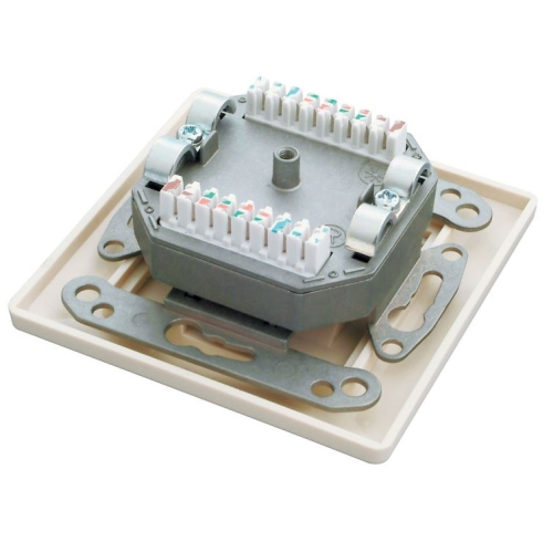 Zásuvka pod omítku vybavena dvěma porty RJ45, STP, kat. 5E. Úhel portů je 45°, pro šetrnější vedení patch kabelů od zásuvky. Pro zařezávání kabelů je zásuvka vybavena svorkovnicí typu Krone 8p8c. Barevné provedení bílé. Rozměry 80 x 80 mm.