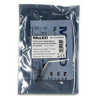 Dotykový stmívač Mc. LED ML‑113. 002. 02. 0 je určen pro řízení intenzity světla jednobarevných LED pásků napájených z nízkonapěťového DC 12 / 24 V zdroje. Ovládání je realizováno dotykem – krátkým poklepem se pásky zapnou nebo vypnou, podržením prstu…