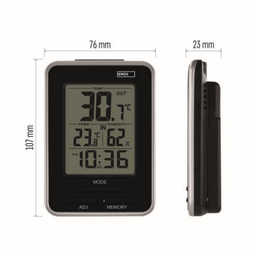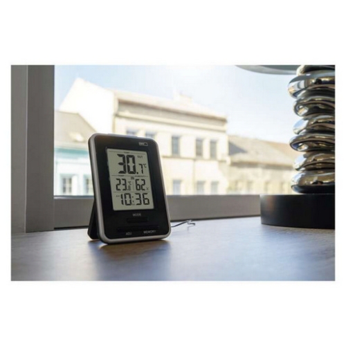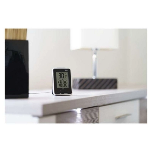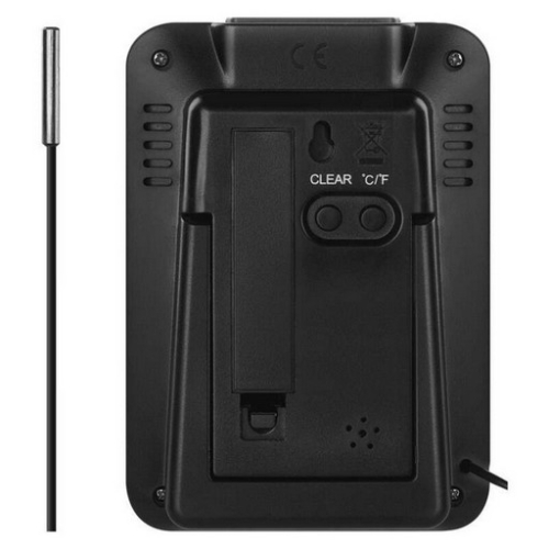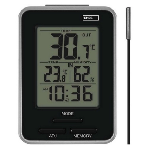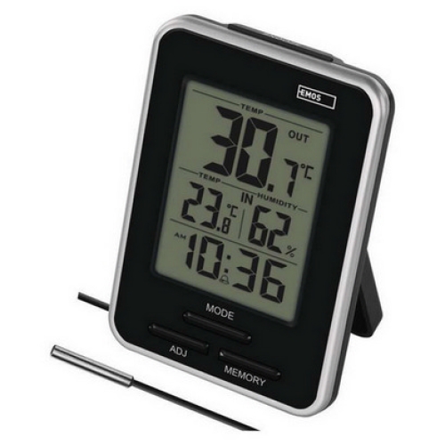 Drátový teploměr se zobrazením venkovní teploty a vnitřní teploty a vlhkosti. Teploměr má drátovou sondu v délce 2,9 m.