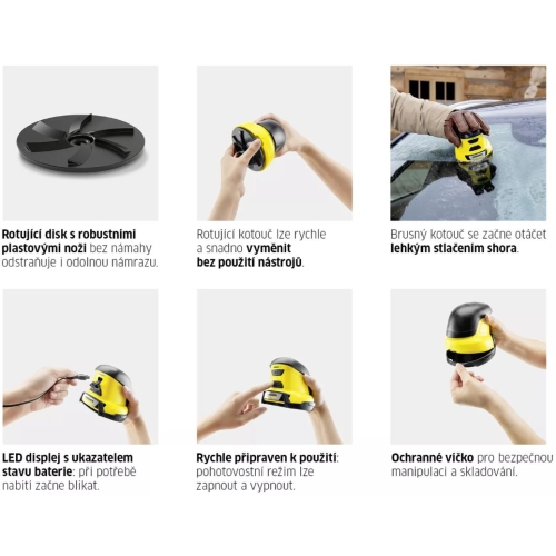 Elektrická škrabka Kärcher EDI 4 na led je praktické akumulátorové zařízení určené k rychlému a pohodlnému odstranění ledu a námrazy ze skel automobilu beh námahy. Díky rotačnímu kotouči s odolnými plastovými čepelemi zvládne i silnější vrstvy ledu uvolnit během několika tahů, a to bez poškození skla. Specifikace elektrické škrabky na led Kärcher EDI, 4 1.598-900.0 Tato elektrická škrabka je vybavena výkonnou lithium-iontovou baterií, která poskytuje až přibližně 15 minut provozu na jedno nabití, což obvykle stačí na kompletní očistu čelního a bočních skel. Pro nabití baterie potřebujete přibližně 3 hodiny, přičemž po nabití můžete škrabku používat opakovaně během víkendových či týdenních oprav ledové krusty na autě. Kompaktní a moderní konstrukce zajišťuje snadné ovládání jednou rukou – stačí lehký tlak shora a kotouč se automaticky roztočí. Vestavěná LED kontrolka signalizuje, kdy je potřeba zařízení nabít. Obsah balení: nabíjecí kabel, ochranný kryt, škrabací kotouč. V K&V ELEKTRO můžete zakoupit i jiné škrabky na sníh, případně i další autodoplňky, domácí spotřebiče a vše pro zahradu. Rozměry škrabky jsou: 133 × 124 × 110 mm. Technické detaily škrabky na led Kärcher Napájení: lithium-iontová baterie Průměr kotouče: 100 mm Počet otáček kotouče: 500 rpm Jmen. napětí akumulátoru: 7,2 V Odběr proudu max.: 14 A Stupeň krytí: IPX1 Třída krytí: III Napětí sítě nabíječky: 100–240 V Výstupní napětí: 9,5 V Výstupní proud: 0,6 A Fáze: 1 Kmitočet: 50–60 Hz Doba nabíjení vybitého akumulátoru: 3 h Provozní doba s plně nabitým akumulátorem: 15 min Teplota prostředí: –20 až +40 °C Teplota dobíjení: 5 až 40 °C Teplota skladování: –20 až +40 °C Relativní vlhkost vzduchu: 20–90 % Hladina akustického tlaku LpA: 65 dB(A) Hlučnost: 79 dB(A) Nejistota KWA: 2 dB(A) Vždy se řiďte postupem od výrobce. Certifikáty výrobku Elektrická škrabka na led Kärcher EDI 4 1.598-900.0 splňuje příslušné normy ČSN. ##VIDEO:https:// https://www.youtube.com/embed/watch?v=EmhMb7afsS4## O společnosti Kärcher Společnost Kärcher se řadí mezi přední výrobce čisticí techniky. Její vznik se datuje k roku 1935, kdy inženýr Alfred Kärcher založil svůj vlastní podnik. Hlavní úspěch přišel v roce 1950, kdy společnost Kärcher uvedla na trh jako první v Evropě vysokotlaký čistič s ohřevem. Tento způsob ohřevu dodnes tvoří základ všech hořáků. V r. 1974 došlo ke změně přístrojů na již proslulou černo-žlutou barvu. Společnost Kärcher již uvedla na trh přes 100 výrobků a celkově působí v 67 zemích. V našem e-shopu si z produkce společnosti Kärcher můžete objednat třeba vysavače a podlahové myčky, tlakové myčky, elektrické a AKU nářadí a ostatní příslušenství.