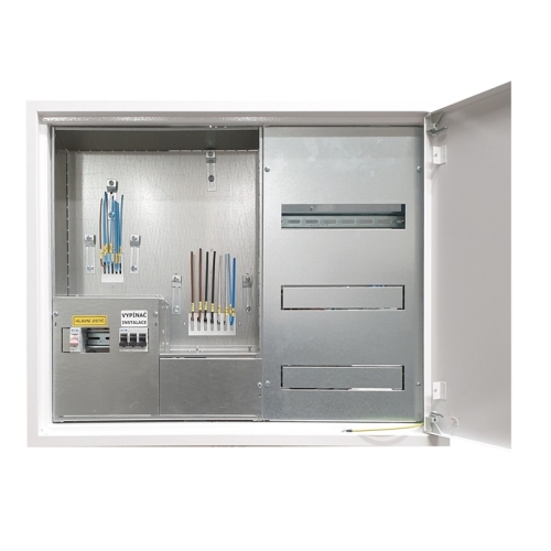Základní provedení: rozvaděč bez hlavního jističe (bez HJ), s vypínačem instalace – do 32. A. Univerzální zapojení pro měření s tarifem nebo měření s tarifem a ovládáním pro FVE V rozvaděči je umístěn vypínač 32. A. Přívodní…