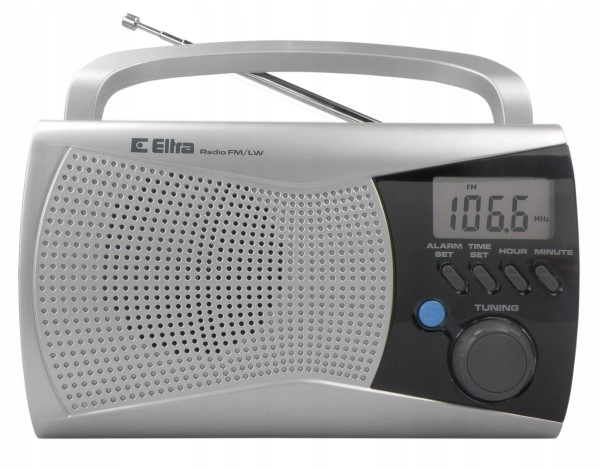 ELTRA Rádio KINGA 2 StříbrnéPřenosný rádiový přijímač s LCD displejem.- Rozsah DLOUHÝCH a UKF vln- Zobrazení frekvence- Funkce hodin s programováním zapnutí přijímače nebo buzení zvukovým signálem- Sluchátkový konektor- Otočná teleskopická anténa- Pohodlná rukojeť pro přenášení- Napájení ze sítě nebo z bateriíSystém: RádioPočet audio kanálů: MonoTuner FM:AnoPásma: FM (UKF),AM LWCD přehrávač: NePřečtené formáty CD: ŽádnéPřečtené formáty DVD: ŽádnéPřehrávání z USB: NeDokovací stanice: NeSpeciální funkce:- Hodiny – Buzení: rádiem nebo zvukovým signálemBezdrátová komunikace: NeKonektory: 3,5 mm minijackBarva:StříbrnáRozměry:215 x 126 x 56 mmHmotnost: 0.6 kgDalší parametry:- Výstupní výkon: 500 mW- Průměr reproduktoru: 3 palce- Regulace hlasitosti: otočná- Programátor:programování zapnutí rádia – Typ displeje: LCD – Typ baterie: R14 – Počet baterií: 4 – Typ tuneru:Analogový – Vlnové rozsahy: FM (UKF) 87,5-108 MHz / LW (Dlouhé) 148,5-283,5 kHz – Použitelná citlivost: FM > 10uV / LW > 5mV/m – Anténa:FM teleskopická, otočná / LW vestavěná – Měřítko: čtení frekvence na LCD displeji – Systém zobrazení:24 hodinový – Synchronizace času: křemenná – Vestavěný síťový zdroj: 230 V ~ 50 Hz