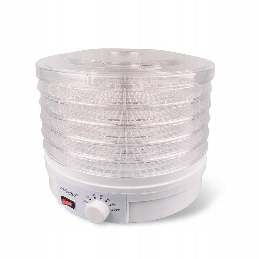 FEEL-MAESTRO Sušička na houby, zeleniny a ovoce 245 W MR-765Sušička hub, zeleniny a ovoce Maestro MR-765 je výkonné zařízení s výkonem 245 W, které je ideální pro sušení různých produktů, jako jsou houby, zelenina, ovoce, bylinky nebo chléb. Je vybavena 5 síty o průměru 32 cm s výškou každého síta 3 cm, což umožňuje současné sušení velkého množství surovin.Zařízení nabízí 7stupňovou regulaci teploty v rozsahu od 35 °C do 70 °C, což umožňuje přesně přizpůsobit podmínky sušení potřebám různých produktů. Mechanické ovládání usnadňuje ovládání a podsvícený spínač dodává moderní vzhled a usnadňuje kontrolu nad provozem sušičky.Sušička Maestro MR-765 může pracovat v nepřetržitém režimu až 40 hodin, což je velmi praktické při sušení většího množství surovin. Zařízení má výšku 26 cm a délka napájecího kabelu je 115 cm, což zajišťuje pohodlné používání a snadné umístění na kuchyňské lince. Sušička je skvělým řešením pro lidi, kteří oceňují přírodní metody konzervování potravin.Počet sít / zásobníků: 5Stupně sušení: 7Ochrana proti přehřátí:AnoVýkon: 245 WMaximální výška síta: 3 cmPrůměr síta: 32 cmFunkce:Sušení hub, zeleniny, ovoce, bylinek, chlebaBarva: bílá,průhlednýRozměry:Výška výrobku: 26 cm Rozměry balení: 33 x 33 x 27 cmHmotnost: 3.5 kg