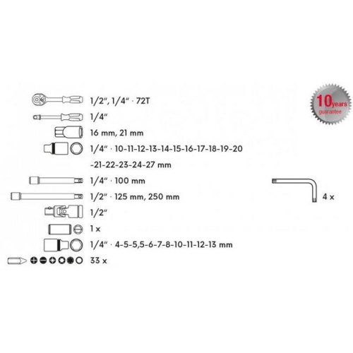 Kvalitní gola sada je vhodná díky kvalitě použitých materiálů a zpracování v profesionální autodílně nebo servisu. 10 let záruka. Všechny části jsou vyrobeny z vysoce kvalitní chrom-vanadiové oceli. Niklová povrchová úprava. Hroty bitů jsou ze slitiny oceli S2. Ráčny mají jemné dělení 72 zubů, tělo ráčny z CrV oceli, zubový mechanismus z S2 oceli, ergonomicky tvarovanou rukojeť se zdravotně nezávadnou gumou. Nový design plastového kufru z primárního materiálu s kovovými uzávěry a panty víka. Obsah sady: Rozměr ráčny: 1/2″ + 1/4″ Prodloužení 1/2″: 125, 250 mm Prodloužení 1/4″: 75 mm Trhák: 1/2″ Hlavice nástrčné 1/2″: 10 – 11 – 12 – 13 – 14 – 15 – 16 – 17 – 18 – 19 – 20 – 21 – 22 – 23 – 24 – 27 mm Hlavice nástrčné 1/4″: 4 – 5 – 5,5 – 6 – 7 – 8 – 10 – 11 – 12 – 13 mm Hlavice na svíčku 1/2″: 16 – 21 mm Bity: 33 ks Příslušenství: adaptéry, kloub, imbusy, šroubovák na hlavice