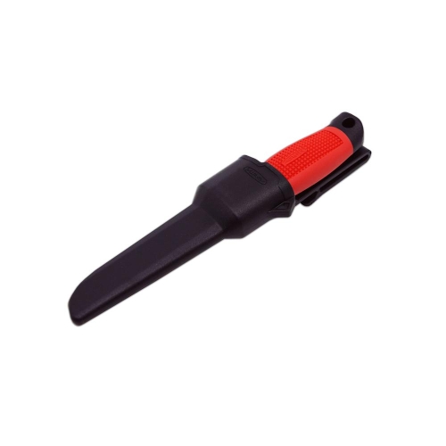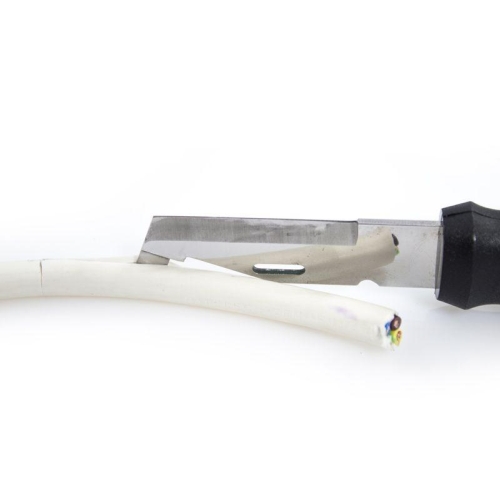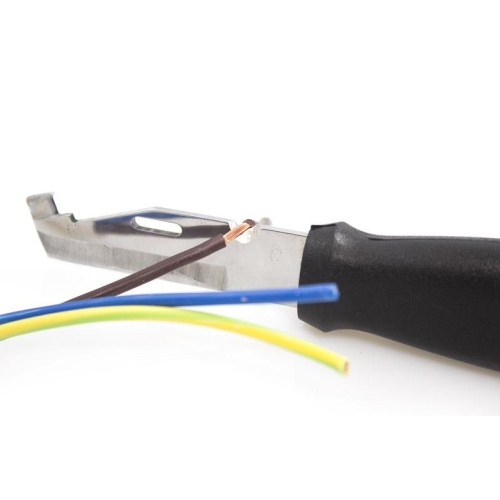 Elektrikářský nůž s botičkou Quattro 349-NH-1 firmy Mikov je svou konstrukcí určen pro montáže a další práce v elektrotechnickém oboru – silnoproud i slaboproud. Nůž má jednu čepel pro více použití, a to: 1. Spodní část slouží k řezání jako běžný nůž. 2. Speciální tvar špičky nože je určen pro prořez plášťů elektrických kabelů a jejich následnému odizolování. 3. Drážka slouží k odizolování samotných vodičů. 4. Otvor v čepeli slouží pro ohýbání drátu a vytváření oček. Nůž výrazně usnadňuje a urychluje práci na slaboproudých i silnoproudých kabelech pro vnitřní rozvodové systémy a rozvodné skříně. Může být použit také v nepřístupných místech s vysokou hustotou kabeláže. Používáním kabelového nože se kromě zvýšené produktivity výrazně snižuje možnost úrazu. Obsahuje speciální nástroj pro podélné řezy izolace silnějších kabelů. Elektrikářský nůž QUATTRO je profesionální nářadí, které by mělo být výbavou každého elektrikáře. Elektrikářský nůž Quattro je vyroben z vysoce kvalitní nerezové oceli typ 420 s tvrdostí 52-55HRc. Ergonomicky tvarované držadlo je vyrobeno z plastu a gumy. Pouzdro je vyrobeno z kvalitního odolnému plastu. Výrobce Mikov Mikulášovice. Počet funkcí: 4