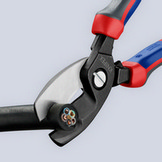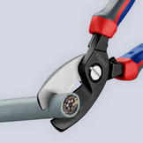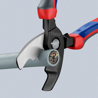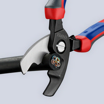 Kabelové nůžky Hladké a čisté břity bez deformací. díky rozdělení řezu na přípravný řez (izolační opláštění v přední části oblasti řezu) a dokončovacího řezu (vodiče v zadní části oblasti řezu) lze stříhat kabely do Ø 20 mm s jednoručním ovládáním. Kryt chrání prsty před skřípnutím. Pro řezání kabelů z Cu a Al. Nevhodné pro ocelový drát a natvrdo tažené měděné vodiče. Kalené břity s precizním výbrusem. Vynaložení malé námahy díky příznivému převodovému poměru a speciální geometrii břitů. Seřizovatelný šroubovaný čep kloubu, samosvorný. Komfortní rukojeť: sestává ze tří ergonomických komponent pro optimální manipulaci a má dvě rozhraní KNIPEXtend pro rozšíření. – Řezná hodnota, měděný kabel, vícevodičový: 70mm² – Řezná hodnota, měděný kabel, vícevodičový: Ø 20mm – AWG: 2 / 0