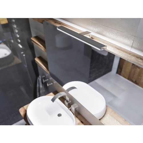 Koupelnové svítidlo s možností instalace přímo na zrcadlo (viz foto) Dostupné varianty: – 8W / 12W – teplá bílá / neutrální Pokud nechcete svítidlo montovat přímo na zrcadlo, podívejte se na podobné svítidlo – PANLUX ELESAR, které je určeno k montáži na zeď.