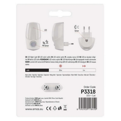 automatické zapnutí/vypnutí: ano, barva světla: teplá bílá, časová prodleva: 90 sekund +/- 3 sekundy, fotosenzor: ano, maximální dosvit: 5 m, maximální světelný tok: 20 lm, max. výstup 1× USB: neuvádí se, max. výstup celkem: neuvádí se, napájení: 230 V, natáčení: ne, ochrana proti přetížení, přepětí a zkratu: neuvádí se, počet USB výstupů: neuvádí se, pohybové čidlo: ano, příkon: 0,8 W max., prodejní obal: 1 ks, papírový blistr, režim svícení: auto, rozměr: 55 × 80 × 102 mm, vypínač: ne, zdroj světla: LED