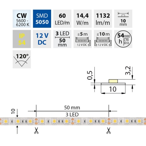 754 KčLED pásek McLED 12V studená bílá š=10mm IP54 14,4W/m 60LED/m SMD5050 ML-121.606.60.0
