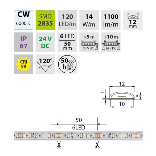 LED pásek SMD2835, studená bílá (6000. K), 14. W, 120. LED, 1100lm/m, CRI>90, segment 50mm, 6. LED/segment, IP67, DC 24. V, životnost 50000h, šíře 12mm, bílý PCB pásek, max. délka pásku při jednostranném zapojení: 5m, opatřen samolepící páskou 3. M, UV…
