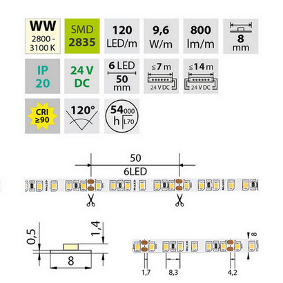 LED pásek SMD2835, teplá bílá (3000K), 9,6W, 120LED, 800lm/m, CRI>90, segment 50mm, 6LED/segment, IP20, DC 24V, životnost 54000h, šíře 8mm, bílý PCB pásek, max. délka pásku při jednostranném zapojení: 10m, opatřen samolepící páskou 3M, UV stabilní.