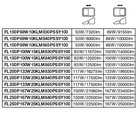 Všestranný reflektor se světelným výkonem až 25 000 lm. Vlastnosti výrobku: Vysoká světelná účinnost: až 150 lm/W. Stupeň krytí: IP66. Předinstalovaný flexibilní 1m kabel (H05RN-F), 3 × 1,0 mm² jednotlivé vodiče, obalené. Symetrické vyzařování na základě technologie reflektorů s úhlem vyzařování 100° × 100°. Montážní konzola s 30° úhlem a širokou rotační plochou. Výhody výrobku: Prodyšná membrána pro optimální výměnu vzduchu, bez dopadu na stupeň krytí IP. Vysoce univerzální díky volitelným stupňům výkonu (Multi Lumen) na krytu. Robustní kabelová průchodka s integrovanou funkcí vodotěsnosti. Bezpečné a velmi rovnoměrné osvětlení díky difuzoru s matným a tvrzeným sklem. Jasné, robustní a odolné. Úspora energie až 90 % ve srovnání s halogenovými reflektory. Nulová hodnota horní účinnosti svítidla (ULOR 0 %) při montáži v náklonu 0°. Oblasti použití: Náhrada za reflektory s halogenovými žárovkami. Venkovní použití (IP66). D-značky podle EN 60598-2-24 pro komerční jednotky s nebezpečím požáru, např. kvůli hromadění prachu. Veřejné prostory. Fasády budov. Stavební plochy. Parkoviště.