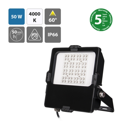 Reflektorové LED svítidlo Delta 50, výkon 50. W, neutrální bílá 4000. K, 6700lm, CRI80, vyzařovací úhel 60°, s optikou, rozměry: 295×215×70mm, IP66, IK08, provozní teplota: -30°C – +50°C. Záruka 5 let.
