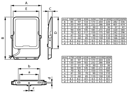 Světlomety Ledinaire All-in, Tlakově litý hliník, Šedá, Dopravní šedá B (RAL7043), Jednovrstvý práškový potah, Předřadník integrovaný na desce LED (DoB), All-in, Multi Color Temperature, 5500 lm, 6000 lm, 50 W, 120 lm/W, 110 lm/W, 3000 K, 4000 K, 6500 K, (0.440,0.403); (0.369,0.364); (0.313,0.337) SDCM5, CRI80, Symetrická, IP65 | Ochrana proti proniknutí prachu, ochrana proti tryskající vodě, IK07 | 2 J zesílená, Bezpečnostní třída I, Úroveň přepěťové ochrany do 1,5kV vdiferenciálním režimu a1,5kV vběžném režimu, Kabel 1,0m bez konektoru, Volné přívody / kabely