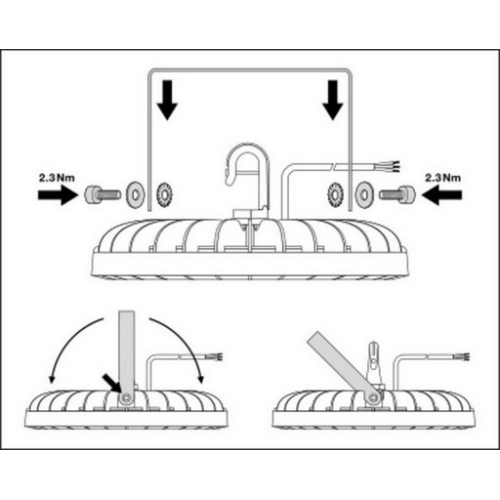 Svítidla pro vysoké stropy až 120 lm/W. Vlastnosti produktu: Provozní teplota: -20…45 °C. Pouzdro z černého hliníku, kryt z temperovaného skla. Opálový kryt. Stupeň krytí: IP65. Životnost (L70): až 50.000 h. Vysoká světelná účinnost: až 120 lm/W. Výhody produktu: Moderní, exkluzivní design. Úspora energie až 60 % v porovnání s běžnými svítidly do vysokých stropů. 3letá záruka. Optimalizovaná hmotnost a velikost kvůli kompaktnosti designu. Oblasti použití: Náhrada za svítidla „high bay“ s obsahem rtuti nebo halogenidové výbojky. Sklady. Logistické haly. Průmysl. Vysoký strop (např. nákupní centra, letiště, komerční objekty, haly). Výbava / příslušenství: Držák k dispozici. K dispozici reflektor.