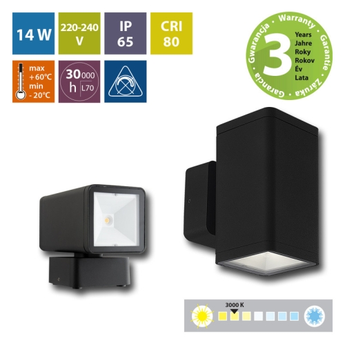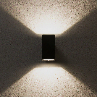 LED venkovní nástěnné svítidlo Verona 2S, černá barva, 2x7W, 230V, IP65, teplá bílá (3000K), světelný tok 2x445lm, vyzařovací úhel 102° – svítí do dvou směrů, CRI 80, životnost až 30.000h, rozměry 90 x 135 x 160, materiál hliník/plast, nestmívatelné.