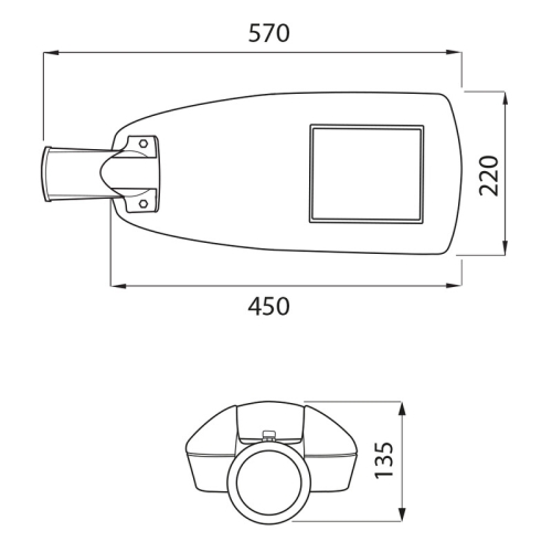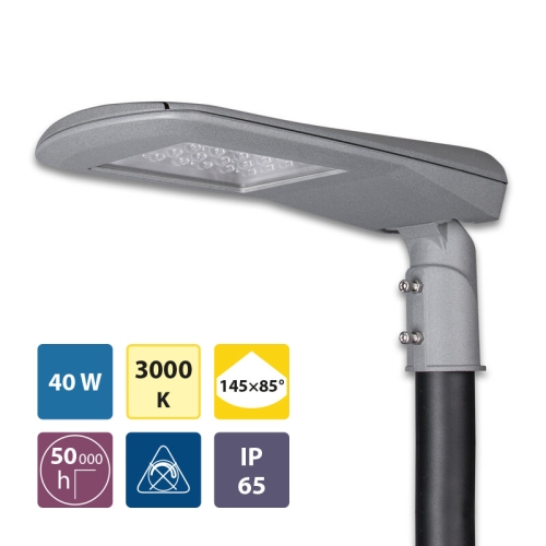 LED pouliční svítidlo 40W, šedá barva, 230V, IP65, 3000K – teplá bílá, světelný tok 4180lm, vyzařovací úhel 145×85°, CRI>70, životnost až 50.000h, rozměry 517x220x117mm, materiál hliník+sklo, nestmívatelné, PF>0,9