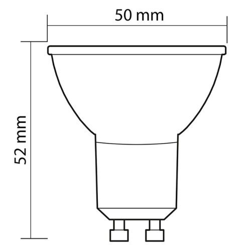 LED žárovka GU10, 3. W(ekvivalent 25. W), 230. V, IP20, 2700. K – teplá bílá, světelný tok Φ use 360° 250lm, vyzařovací úhel 38°, CRI80, úspora až 85%, životnost až 25. 000h, rozměry o 50×52, materiál PBT/plast, nestmívatelné