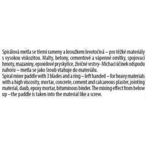 Míchadlo – pravotočivé (míchací účinek odspodu nahoru) – metla, pozinkované, rozměr: M14 120 x 600 mm – M14, použití : pro těžké materiály s vysokou viskozitou, malty, betony, cementové a vápenné omítky, spojovací hmoty, mazaniny,…