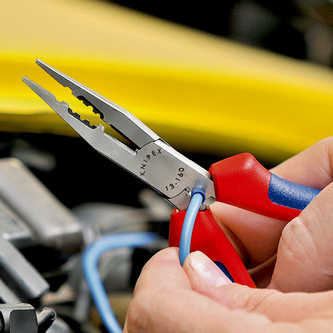 Elektrikářské kleště ideální kleště pro provádění kabeláží K uchopení a ohýbání drátů. Pro řezání středně tvrdého a tvrdého drátu. Precizní břity s doplňkovým induktivním zakalením, tvrdost břitu asi 60 HRC. S přesnými otvory pro odizolování. K lisování kabelových koncovek. – Řezné hodnoty, polotvrdý drát (průměr): Ø 2,5 – Řezné hodnoty, měkký drát (průměr): Ø 1,6 – Hodnoty odizolování, milimetry čtvereční: 0,5 — 0,75 / 1,5 / 2,5mm²