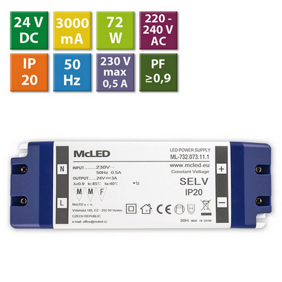 1 073 KčNábytkový LED napájecí zdroj McLED 24VDC 72W 3A ML-732.073.11.1