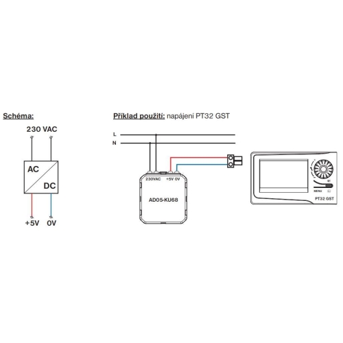 Nápájecí zdroj k montáži do instalační krabice. 230V AC/OUT 5V DC 1,4A Popis produktu Vlastnosti AD05-KU68: Lze jej použít pro napájení PT32GST, BPT32GST, GSM modulů GST1/GST2, centrálních jednotek PH a bezdrátových zvonků. Výstupní proud je omezen elektronickou pojistkou, při překročení maximálního proudu zdroj vypne a po krátké časové prodlevě znovu zapne. Zdroj je vybaven ochranou proti zkratu – při zkratu na výstupu zdroj vypne. Zdroj je určen pro vnitřní instalace!