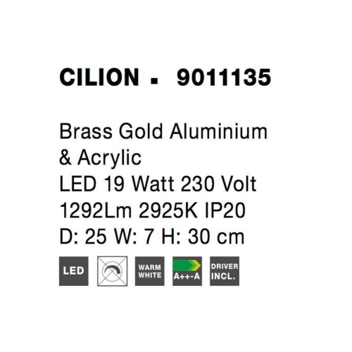 Elegantní nástěnné LED svítidlo NOVA LUCE CILION je ideální pro ty, kteří hledají spojení nadčasového designu a moderní technologie. Díky integrovanému LED světelnému zdroji s výkonem 19 W nabízí efektivní světelný tok 1 292 lm. Prosvítí váš interiér příjemným teplým světlem s chromatičností 2 925 K, navíc v luxusním mosazném provedení, které dodá prostoru elegantní šmrnc. Specifikace nástěnného LED svítidla NOVA LUCE CILION 19W 3000K 9011135 Svítidlo NOVA LUCE CILION je perfektní volbou do interiéru, kde se cení vysoká funkčnost skloubená s moderním stylem. Díky hliníkové skříni je nejen robustní, ale také esteticky příjemné na pohled. S Krytím IP20 je určeno výhradně pro interiéry, kde poskytne optimální osvětlení. Nabízená teplota chromatičnosti 2 925 K zajistí hřejivý a útulný světelný dojem. Jednoduchá instalace umožňuje umístit svítidlo na stěnu nebo strop. Shrnutí a doporučení produktu Svítidlo NOVA LUCE CILION skvěle doplní váš interiér, ať už se chystáte osvětlit obývací pokoj, pracovnu nebo ložnici. Je ideálním řešením pro odpočinkové prostory díky příjemnému teplému světlu. Zkombinujte toto svítidlo s dalšími svítidly ze sekce designová svítidla a pro další inspiraci vám doporučujeme si prohlédnout další stropní a nástěnná svítidla, případně se podívejte na naše kompletní portfolio interiérových svítidel a osvětlení včetně světelných zdrojů. O společnosti NOVA LUCE Renomovaná řecká společnost NOVA LUCE poskytuje od r. 2007 novou definici vnímání osvětlení, ve kterém se pojí moderní estetika s funkčností a kvalitním zpracováním. Výrazný, ale elegantní design proto nezapomíná na praktičnost, ať už jde o závěsná, stropní, nástěnná nebo venkovní svítidla. V jejich portfoliu najdeme jak technické prvky pro profesionální instalace, tak dekorativní kolekce pro stylové interiéry.