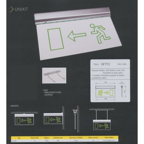 Nouzové trvale svítící LED svítidlo s praporkem UNIXIT UX340 (P+L- šipka do strany) Součástí balení svítidla je držák k namontováni na stěnu , ať už souběžně se zdí nebo kolmo, prodávaný i samostatně jako příslušenství UX01. Lze namontovat i jako závěsné s příslušenstvím UX02 Rozměry: 346x197x32mm Světelný tok 19lm