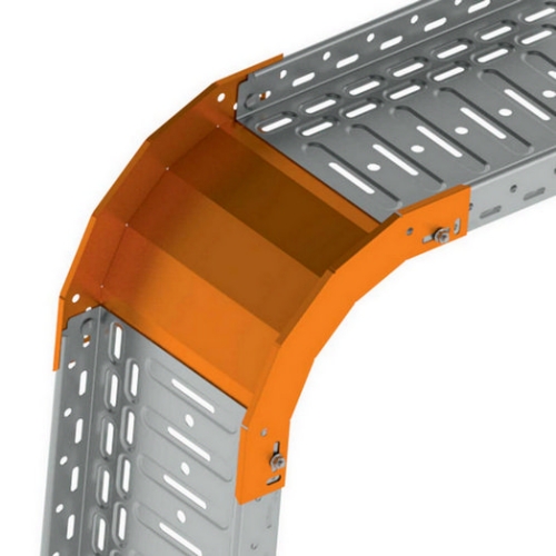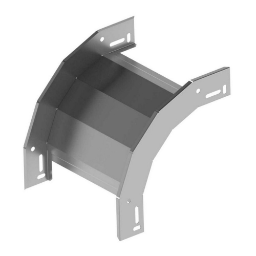 Klesající oblouk pro kabelové trasy rozměru 50×125, povrchová úprava sendzimir, spojení s kabelovými žlaby je bez použití spojek, slouží k vytvoření klesání trasy pod úhlem 90°