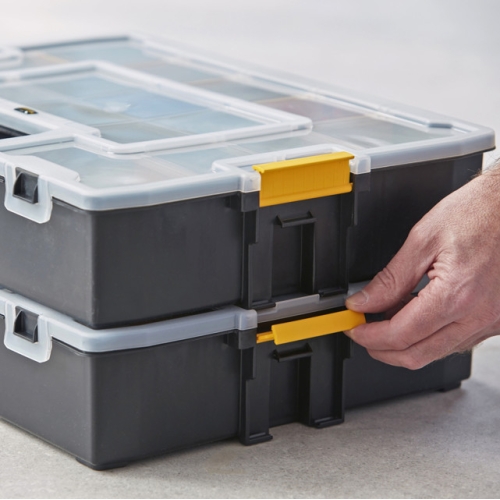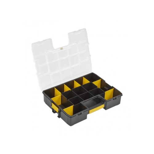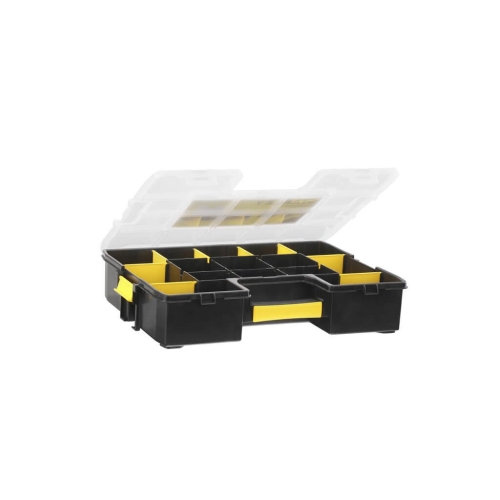 Profesionální organizér Stanley SortMaster Variabilní systém přihrádek pro snadné uskladnění jak drobností tak i nářadí jako jsou šroubováky, kladiva, kleště, nože apod. Vyjímatelné rozdělovače dovolují nastavovat různé velikosti přihrádek. Speciální design víka zajišťuje pevné držení přihrádek – zabraňuje tak vysypání součástek uložených v přihrádkách organizéru. Pevné zámky k zabezpečení obsahu. Možnost stohování více organizérů. Celková hmotnost: 1,1 kg