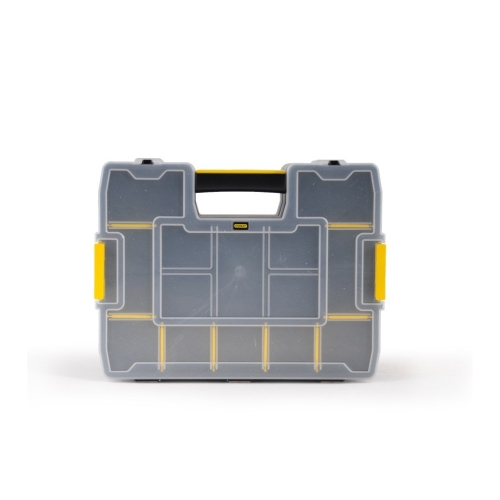 Organizér Stanley SortMaster Junior Variabilní systém přihrádek pro snadné uskladnění jak drobností tak i nářadí jako jsou šroubováky, kladiva, kleště, nože apod. Nabízí až 512 možností konfigurací úložného prostoru. Vyjímatelné rozdělovače dovolují nastavovat různé velikosti přihrádek. Bočním posuvným zámkem lze zajistit během přenášení obsah. Víko se zámkem zabraňuje přesypání obsahu z jedné přihrádky do druhé. Možnost stohování více organizérů. Celková hmotnost: 610 g