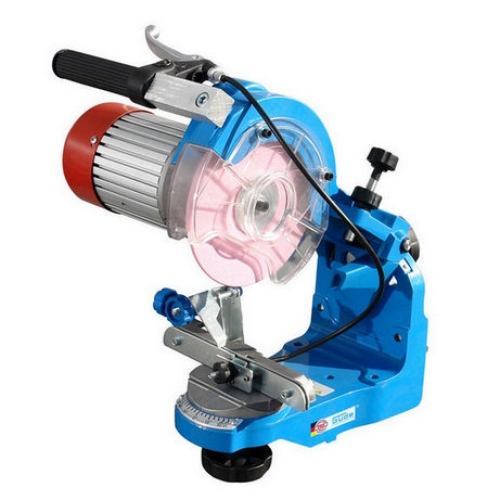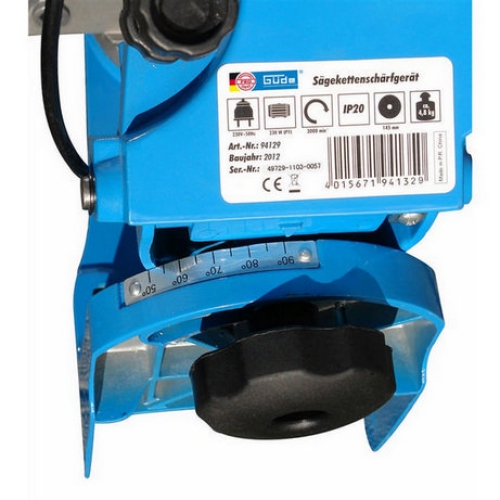 Kompaktní bruska, určená k ostření všech běžně používaných typů řetězů elektrických i motorových pil v podmínkách servisních dílen, specializovaných prodejen apod. Funkce: • oboustranné broušení všech článků řetězu díky naklápění brusného kotouče (90°-> 50°) a polohovatelnému upínacímu mechanizmu (35°/0°/35°; 10°/0°/10°) • rychloupínání řetězu stisknutím ovládací páčky • osvětlení ostřené plochy (-> vestavěná lampička 15 W). Motor 230 W/P1, vypínač v ochranném pouzdru, 1,5 m napájecí kabel H05 VV-F. Konstrukce: korpus brusky z litého hliníku, naváděcí rukojeť včetně fixační páčky, upínací stolek, hloubkový doraz, základová část s otvory pro montáž napevno (2). Příslušenství: 3 brusné kotouče (-> šířka 3,2/4,7/6,0 mm). Celkové rozměry (d x š x v): 340 x 210 x 475 mm, hladina akustického výkonu LWA: 85 dB (A), elektrická ochranná třída: IP 20/I.