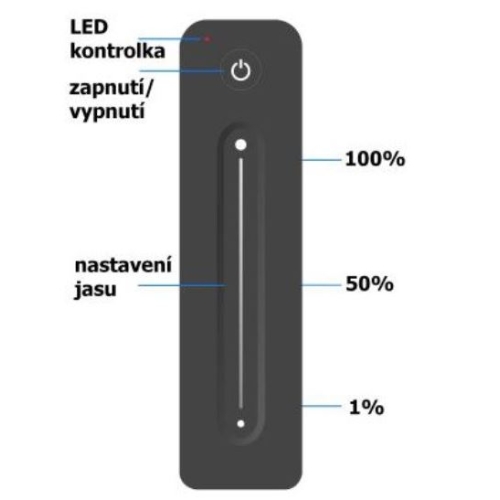 Dálkový ovladač dimLED OV LINEA S je bezdrátový radiofrekvenční ovládací systém, jednoho ovladače a několik přijímačů.;Ovladač je určený pro ovládání jednobarevného osvětlení jako jsou například LED pásky nebo LED žárovky. S jedním ovladačem lze ovládat 1 zónu, která se může skládat z několika přijímačů. Tyto přijímače se po sehrání s ovladačem ovládají jako jedna sekce. Přijímač může být ukrytý (za zdí, sádrokartónem či ve skříni), není nutná přímá viditelnost přijímače pro ovladač. Při nepoužívání ovladače dojde po cca 30s k přechodu do standby režimu. Pro opětovné aktivování ovladače podržte tlačítko ON/OFF pásek zareaguje, a tím se ovladač opět aktivuje. Vlastnosti a výhody systému dimLED: Stmívání je stabilní a spolehlivé, dosah ovladače ≤ 30M. Stmívání v rozmezí 0-100%, 256 úrovní stmívání, stmívání měkké, bez blikání. Při zapnutí dojde k pozvolnému rozsvícení, při vypnutí dojde k pozvolnému setmění. Součástí balení je magnetický držák. Specifikace ovladače: Napájení ovladače Baterie 2032 3V – součást balení Přenosová frekvence 2,4GHz Dosah 30m Počet zón 1 samostatná Počet přijímačů Lze spárovat neomezeně přijímačů Rozměry 139 x 36 x 11mm Obsah balení ovladač, baterie, držák na zeď Paměť posledního nastavení po odpojení napájení: ANO Stupeň krytí: IP20