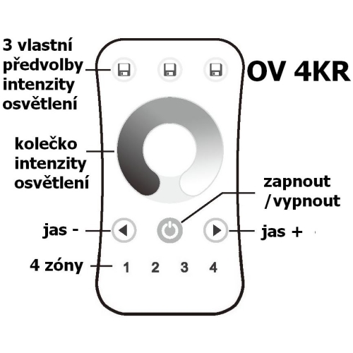 Dálkový ovladač dimLED OVS 4KR je bezdrátový radiofrekvenční ovládací systém, jednoho ovladače a několik přijímačů. S jedním ovladačem lze ovládat nezávisle 4 zóny, která se může skládat z několika přijímačů. Tyto přijímače se po sehrání na jednotlivé předvolbě na ovladači ovládají jako jedna sekce. Přijímač může být ukrytý (za zdí, sádrokartónem či ve skříni), není nutná přímá viditelnost přijímače pro ovladač. Vlastnosti a výhody systému dimLED: Stmívání je stabilní a spolehlivé, dosah ovladače ≤ 30M. Stmívání v rozmezí 0-100%, 256 úrovní stmívání, stmívání měkké, bez blikání. Při zapnutí dojde k pozvolnému rozsvícení, při vypnutí dojde k pozvolnému setmění. Specifikace ovladače: Napájení ovladače Baterie 2032 3V Přenosová frekvence 2,4GHz Dosah 30m Počet zón 4 nezávislé Synchronní ovládání vybraných zón Ano Počet přijímačů lze spárovat neomezeně přijímačů Rozměry 107 x 58,5 x 9mm Obsah balení ovladač, baterie, držák na zeď Paměť posledního nastavení po odpojení napájení: ANO Stupeň krytí: IP20
