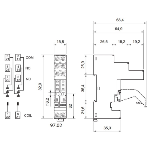 Patice pro relé řady 46 – Řada 97 Patice se šroubovými svorkami k upevnění na DIN-lištu, zásuvka pro časový modul 86.30 a pro indikační a odrušovací EMC moduly 99.02 bezpečné oddělení dle ČSN EN 50178 a ČSN EN 60204 mezi cívkou a kontaktními sadami