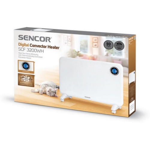 Bílý digitální teplovzdušný konvektor SENCOR SCF 3200. WH s max. příkonem 1 500 W nabízí 2 stupně výkonu, termostat, ochranu proti přehřátí i převržení a 4 provozní režimy, jako třeba ECO režim. Ideální topidlo pro rychlé…