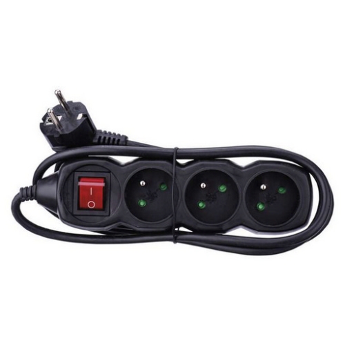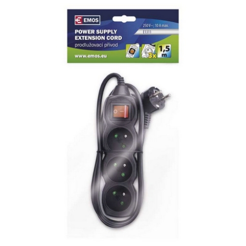 Černý prodlužovací přívod, 3 zásuvka s vypínačem, délkou 1,5 m a průřezem vodiče 1 mm2. Vhodný pro maximální zátěž 10 A max. Prodlužovací přívod 1,5 m na 230 V~ slouží k prodloužení elektrické energie tam, kam pevná zásuvka nedosáhne.