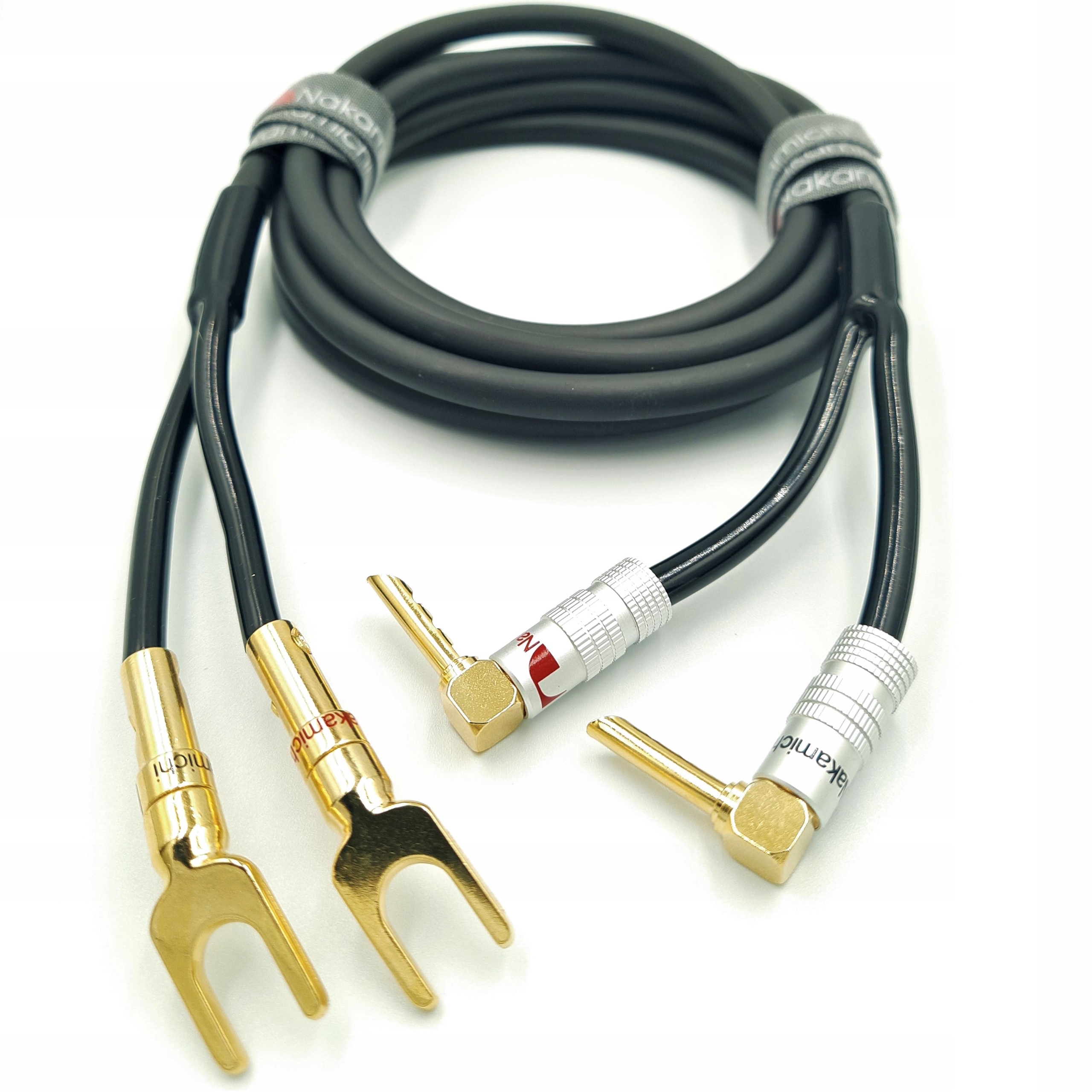 AUDIOFILSKÝ reproduktorový kabel Klotz LY240S 2×4 mm² s úhlovými a vidlicovými banánkovými konektory BFA Nakamichi HQ Premium Copper Alloy 24k Gold 12 mAukce se týká 1 ks hotový reproduktorový kabel – jako na fotografiiKOMPLETNÍ SADA OBSAHUJÍCÍ:Reproduktorový kabel Klotz LY240S 2×4 mm² OFC o délce 12 m,2x banánkové reproduktorové konektory BFA úhlové Nakamichi,2 x vidlicové reproduktorové konektory Nakamichi,2x silikonové tričko pro konfekci kabelů L/XL Nakamichi,2x úsek pásky Nakamichi o délce cca 15 cm.Kabel byl sestaven na základě audio částí nejvyšší kvality – pro nejnáročnější audiofily, profesionálně připravený AUDIO-FILem!Ušetřete si čas a vyberte si hotový kabel, abyste vydělávali na něčem jiném než na vydělávání kabelů! Jeden univerzální reproduktorový kabel s možností rychlé výměny konektorů.Reproduktorový kabel Klotz LY240 2x 4 mm² Cu OFCProfesionální, flexibilní reproduktorový kabel s průřezem žil 4 mm², který se vyznačuje nejvyššími parametry, je vyroben z velmi čisté bezkyslíkaté mědi OFC 99.96% a mechanicky odolných izolačních materiálů.DVOJITÁ IZOLACE PRŮVODCE – řešení umožňující eliminovat signálové rušení v mnohem větší míře než u běžných kabelů s transparentní izolací!Technické údaje:pevný kabel vyrobený z velmi kvalitní mědi OFC o čistotě až 99.96 %dvojitá izolace vodičeodolná černá PVC izolace,velká flexibilita kabelu,průřez vodiče: 2 x 4 mm²svazek: 224 x 0,15 mm,geometrie TWINAX: 2 vodiče srolované dohromady pro eliminaci vlastních interferencí,vnější průměr: 11,0 mm,impedance žil: < 4,5 Ohm/km,kapacita (1 kHz): 178 pF/m,indukčnost (1 kHz): 0.50 iH/m,hmotnost: 185 g/m,pevnost napětí: 2000 V,rozsah provozní teploty: -25 °C / +70 °CBanánové konektory BFA Nakamichi HQ Premium 24k GoldKonstrukce banánového konektoru byla navržena tak, aby zaručovala nejvyšší kvalitu a nejlepší zvuk zvuku. Konektor je vyroben ze slitiny mědi, zatímco konektor je pozlacený 24karátovým zlatem!VĚTŠÍ KONTAKTNÍ PLOCHA NEŽ U KLASICKÝCH BANÁNOVÝCH ZÁSTRČEK!Specifikace:řada HQ Premium – vysoká kvalita zpracování,materiál konektoru: SLITINA MĚDI – nejlepší přenos a kvalita signálu,konektor je plátován 24karátovým zlatem, což zajišťuje ochranu před oxidací a eliminuje ztráty vznikající na spoji,max. průřez zaváděného kabelu: 6 mm² - bez hliníkového pouzdra, 4 mm² - s hliníkovým pouzdrem, díky kterému lze přizpůsobit téměř jakýkoli kabel,konstrukce ve tvaru kovové desky stočené do válce s úzkým rozparkem zajišťuje větší plochu kontaktu konektoru s reproduktorovým konektorem než u klasických banánkových konektorů, hodí se také do zásuvky o průměru 4 mm,zesílené hliníkové pouzdro s drsným povrchem usnadňuje uchopení zástrčky,montáž kabelu pomocí dvou šroubů bez nutnosti pájeníAUDIOFILSKÉ vidlicové reproduktorové konektory Nakamichi HQ Premium Hi-End Copper Alloy 24k GoldKonstrukce vidlicového konektoru byla navržena tak, aby byla zaručena nejvyšší kvalita a nejlepší zvuk zvuku. Tělo je vyrobeno ze slitiny mědi, která byla pozlacena 24 karátovým zlatem! Vidličky byly vytvořeny pro spolupráci s Hi-Endovým zařízením, kde je důležitá největší kontaktní plocha na silnici zesilovač/reproduktor-reproduktor, při zachování nejvyšší kvality přenosu zvuku.Specifikace:řada HQ Premium Hi-End – nejvyšší kvalita zpracování,materiál těla: slitina mědi – nejlepší přenos a kvalita signálu,konektor je plátován 24karátovým zlatem, což zajišťuje ochranu před oxidací a eliminuje ztráty vznikající na spoji,max. průřez zaváděného kabelu: 6 mm², díky čemuž lze přizpůsobit téměř jakýkoli kabel,vidlicová konstrukce zajišťuje perfektní přizpůsobení standardnímu konektoru o průměru až 8 mm a zároveň zajišťuje největší kontaktní plochu mezi dostupnými konektory,zesílené hliníkové pouzdro s drsným povrchem usnadňuje uchopení zástrčky,montáž kabelu pomocí dvou šroubů bez nutnosti pájeníSilikonové tričko Nakamichi typu Y pro konfekci reproduktorových kabelů L/XL 12 mmřada HQ Premium – vysoká kvalita zpracování,materiál: pružný silikon,barva: černá,Průměr vstupního otvoru (D1): 12 mm,Průměr výstupního otvoru „rukávů“ (D2): 5.5 mm,Délka dvou „rukávů“ (L2): 72 mm,konstrukce