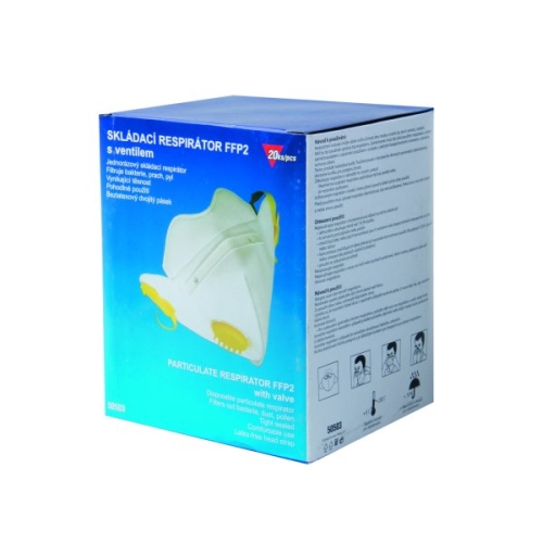 Skládaný respirátor s výdechovým ventilkem, filtrační médium z polypropylenu, nastavitelná nosní svěrka, nastavitelná délka pomocí dvojitého gumového pásku, měkká nosní pěna, FFP2, CE EN 149.